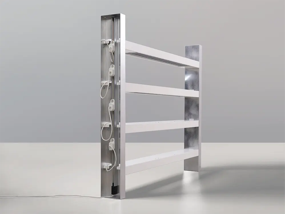 Aluminum, steel (coated), stainless steel (hand polished), glass fluorescent tubes, electrical components