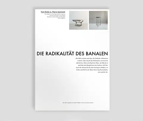 Сопоставление двух авторов. В их архетипических работах отражаются поиски основополагающего. Эти вневременные артефакты игнорируют веяния моды и преходящую погоню за эффектами. Исповедуя радикальность обнаженного, они позволяют увидеть в грубом и банальном неведомые ранее глубины. Чуждые маньеристскому баловству, предметы мебели становятся проекциями картины мира и экзистенциальных ощущений. Здесь дизайн становится искусством, выходящим за пределы эстетики сферы услуг, а объекты не прячутся за псевдо-интеллектуальной риторикой.